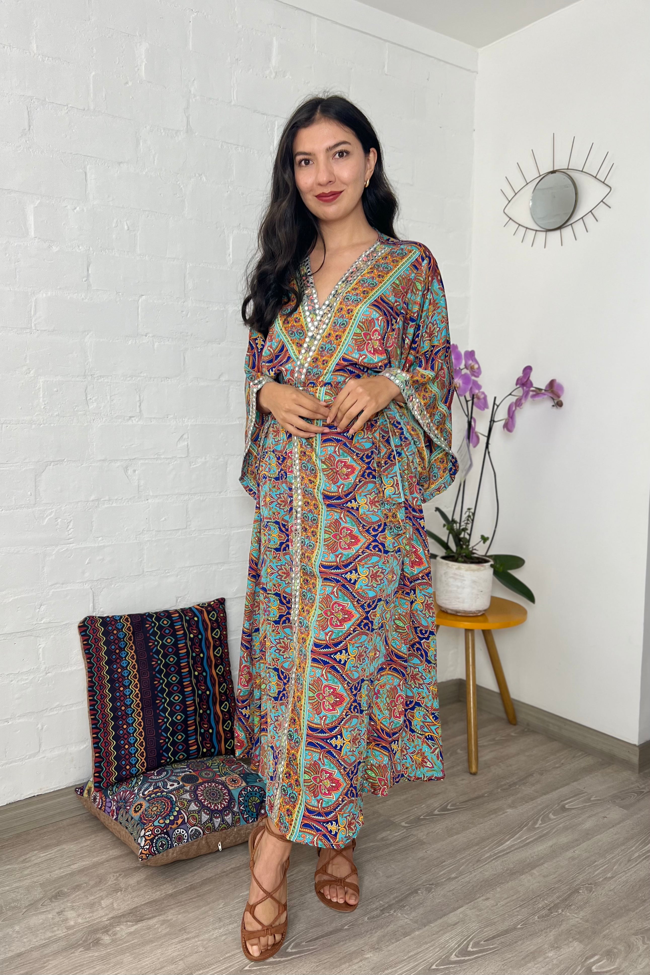 Descubre nuestro Kimono largo. Su bellos estampado te asegura lucir espectacular en cualquier ocasión. Material Seda Hindu.