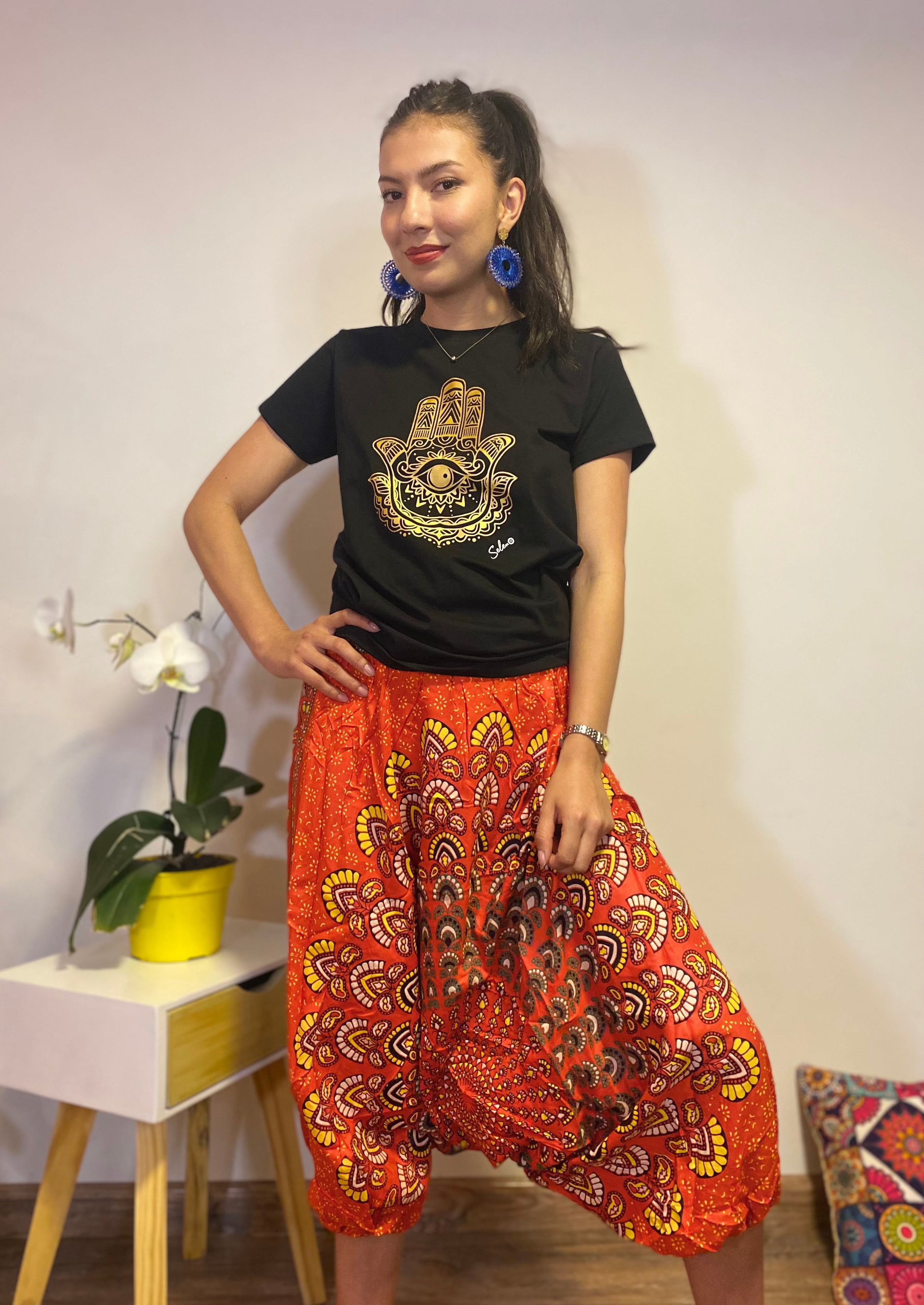 Pantalón harem de rayón, con tiro alto y silueta holgada. Cuenta con una cintura elástica amplia que brinda gran comodidad.
