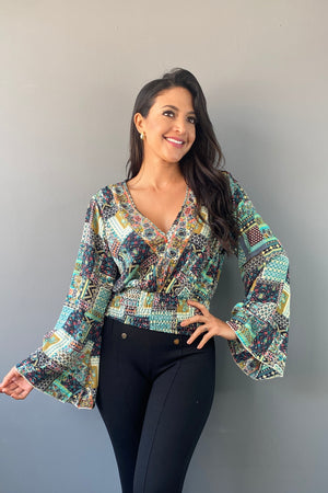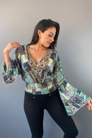 Eleva tu estilo con esta exquisita blusa de seda hindú de alta calidad. Su diseño elegante con cuello en V y mangas mariposa le aportan un toque único y versátil. Perfecta tanto para ocasiones especiales como para crear un look casual con un toque bohemio. ¡Una prenda imprescindible en tu guardarropa que te hará destacar en cualquier momento!