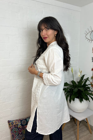 Blusón Seleno, confeccionado en algodón hindu, una tela suave y fresca que puedes lucir tanto como blusa o vestido corto. Perfecto para añadir versatilidad y estilo a tu guardarropa. Este blusón es abierto y tiene bolsillos