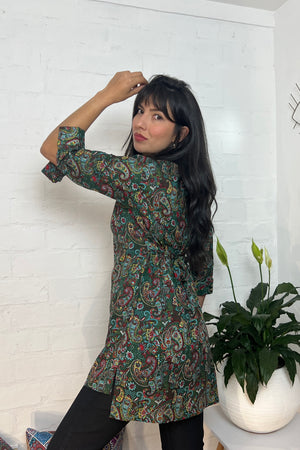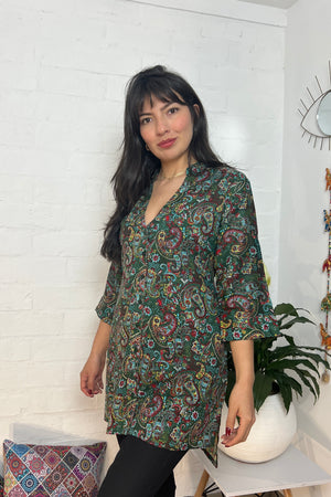 Descubre el Blusón Seleno, confeccionado en suave y fresco rayón hindú, ideal para esos días donde quieres lucir cómoda y con estilo. Su diseño cerrado al frente le aporta un toque elegante y sutil que realza su versatilidad: úsalo como una blusa sofisticada o un vestido corto casual.