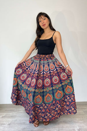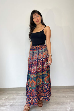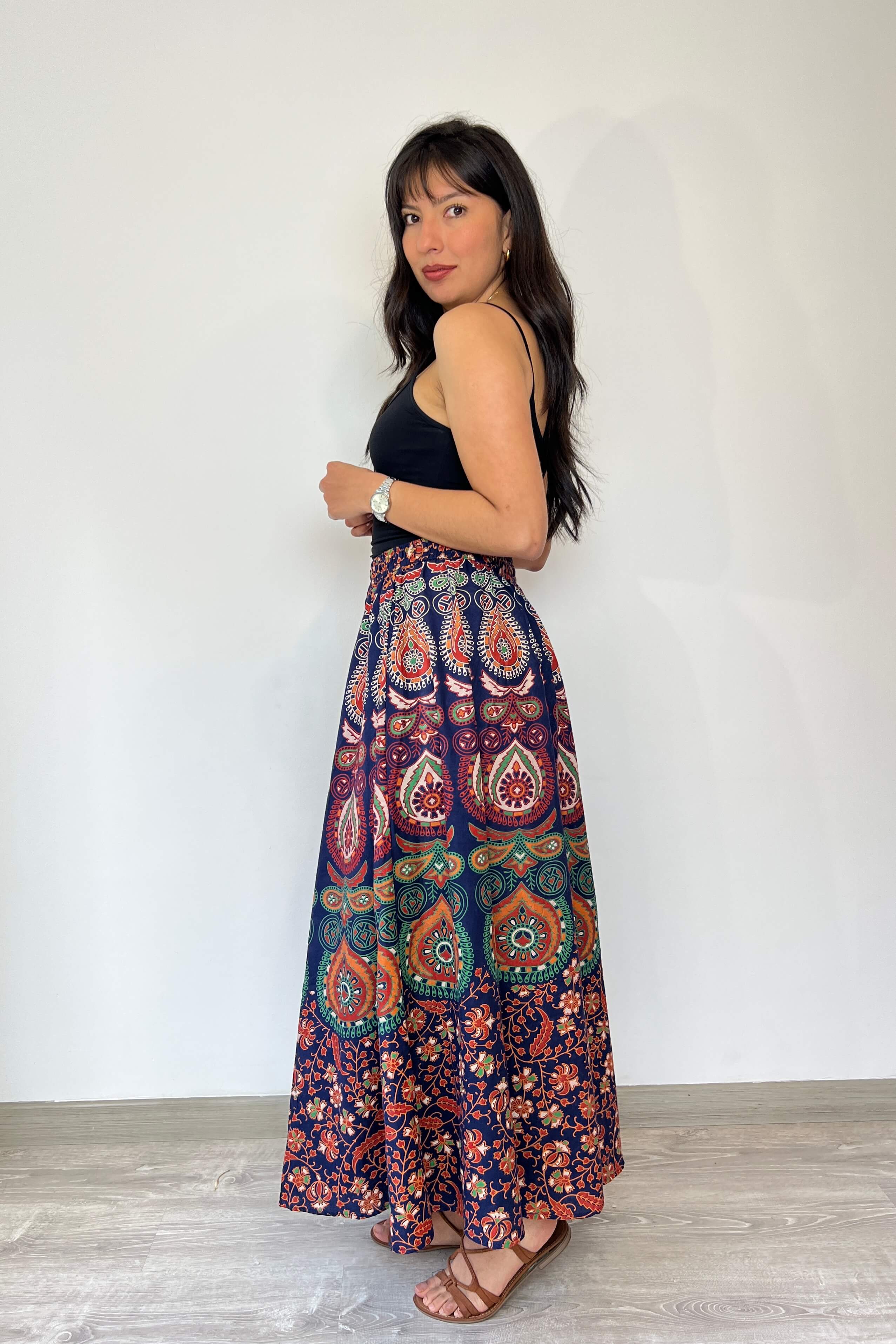 Esta falda larga está confeccionada en suave algodón hindú con cintura elástica que se adapta cómodamente a tu cuerpo. Cada pieza es única: su tela ha sido impresa con técnicas artesanales tradicionales e importada directamente desde la India.
