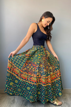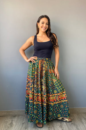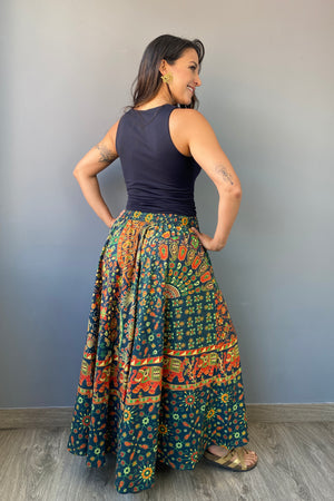 Esta falda larga está confeccionada en suave algodón hindú con cintura elástica que se adapta cómodamente a tu cuerpo. Cada pieza es única: su tela ha sido impresa con técnicas artesanales tradicionales e importada directamente desde la India.