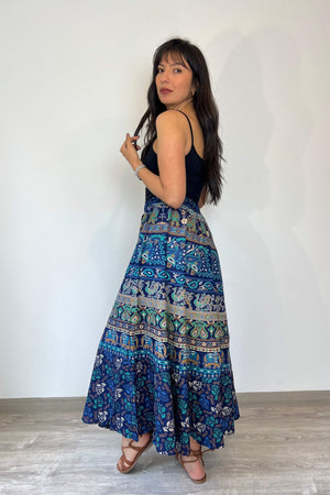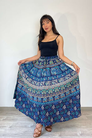 Esta falda larga está confeccionada en suave algodón hindú con cintura elástica que se adapta cómodamente a tu cuerpo. Cada pieza es única: su tela ha sido impresa con técnicas artesanales tradicionales e importada directamente desde la India.