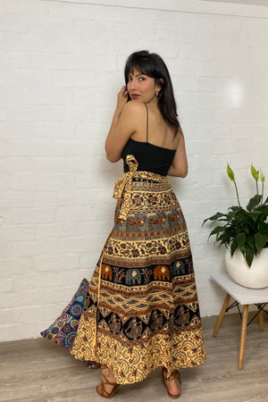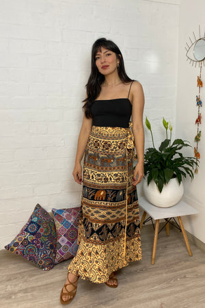 Falda larga envolvente confeccionada en algodón hindú. La tela está impresa con técnicas artesanales, importada de la India.