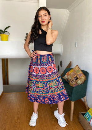 Falda corta envolvente, confeccionada en algodón hindú. La tela está impresa con técnicas artesanales, importada de la India. Talla Unica
