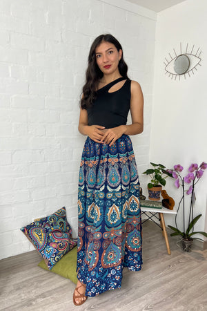 Falda larga confeccionada en algodón hindú, con cintura elástica y ajustable. La tela está impresa con técnicas artesanales, importada de la India.