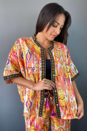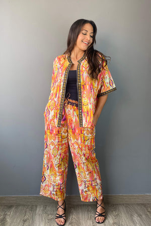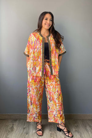 Conjunto de dos piezas con estampado colorido. Incluye un blazer ligero de caída recta con detalles geométricos en el borde y un pantalón de pierna ancha con cintura elástica ajustable.