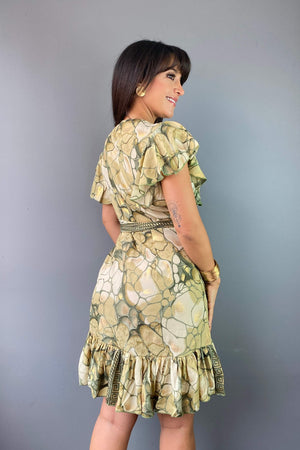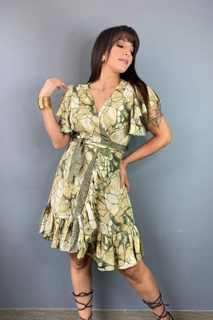 Una pieza llena de movimiento, frescura y elegancia. Su estampado efecto piedra en tonos tierra, combinado con volantes delicados y un cruce estilo wrap, crea una silueta favorecedora y femenina. El cinturón ajustable realza la cintura y permite adaptar el fit a tu medida, mientras sus mangas con vuelo aportan ese toque bohemio que distingue a las prendas de Seleno Shop.