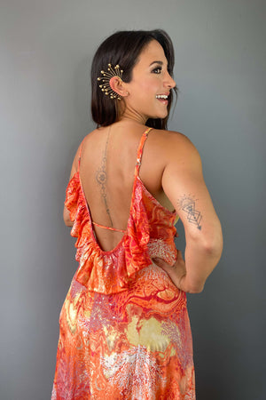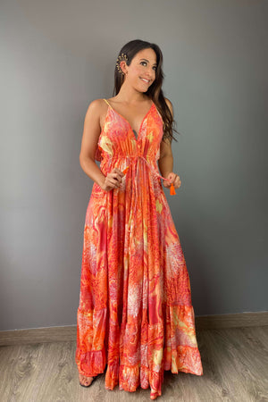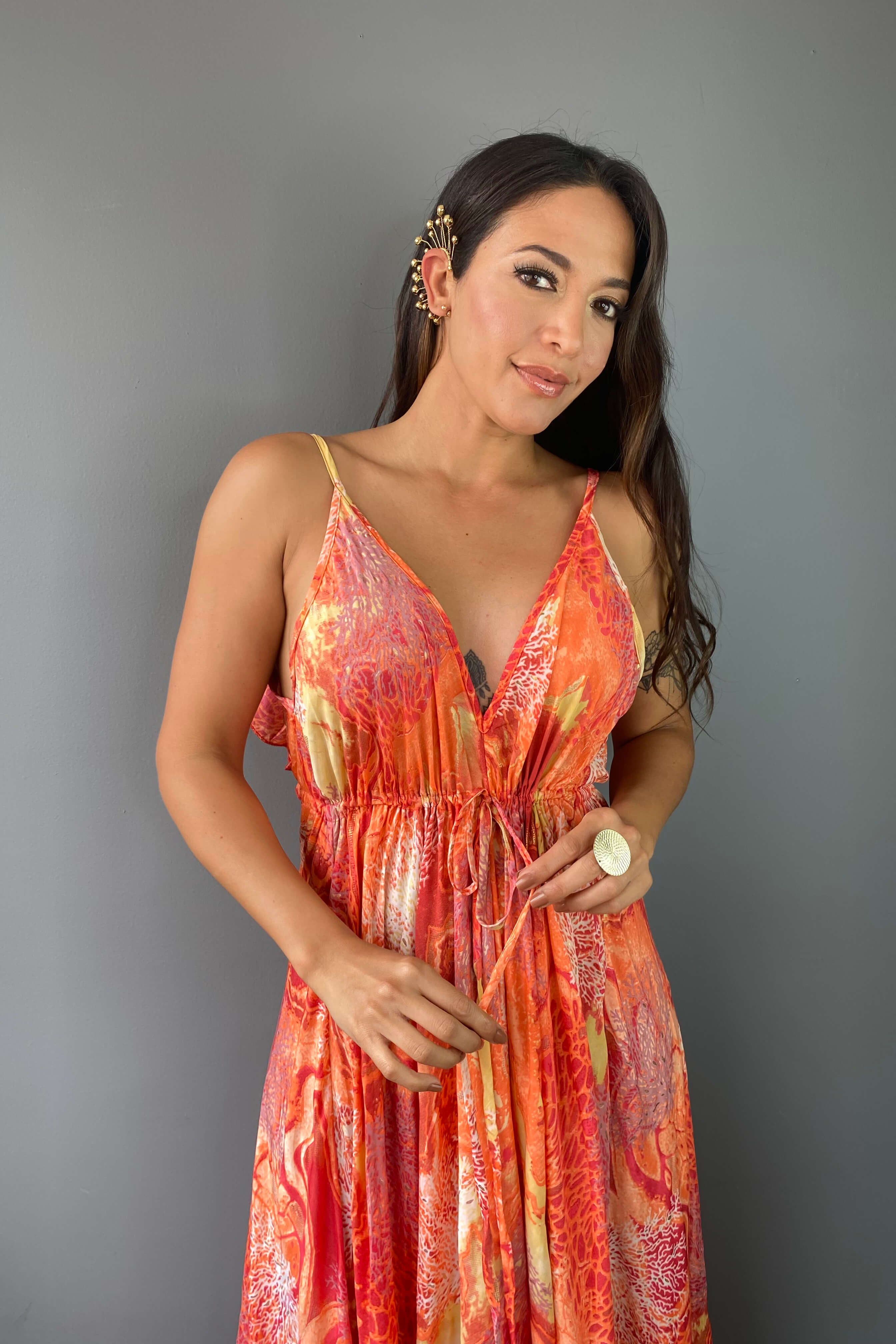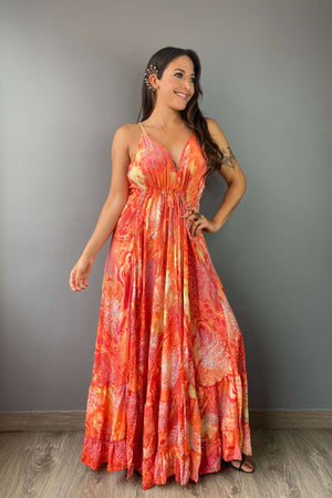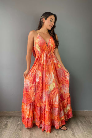 Vestido Boho confeccionado en seda fría hindú, una tela suave, fresca y con excelente caída. Sus tiras ajustables permiten adaptarlo a tu gusto y su bolero en la espalda lo convierte en una prenda única y especial, ideal para resaltar tu estilo bohemio.