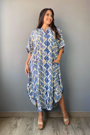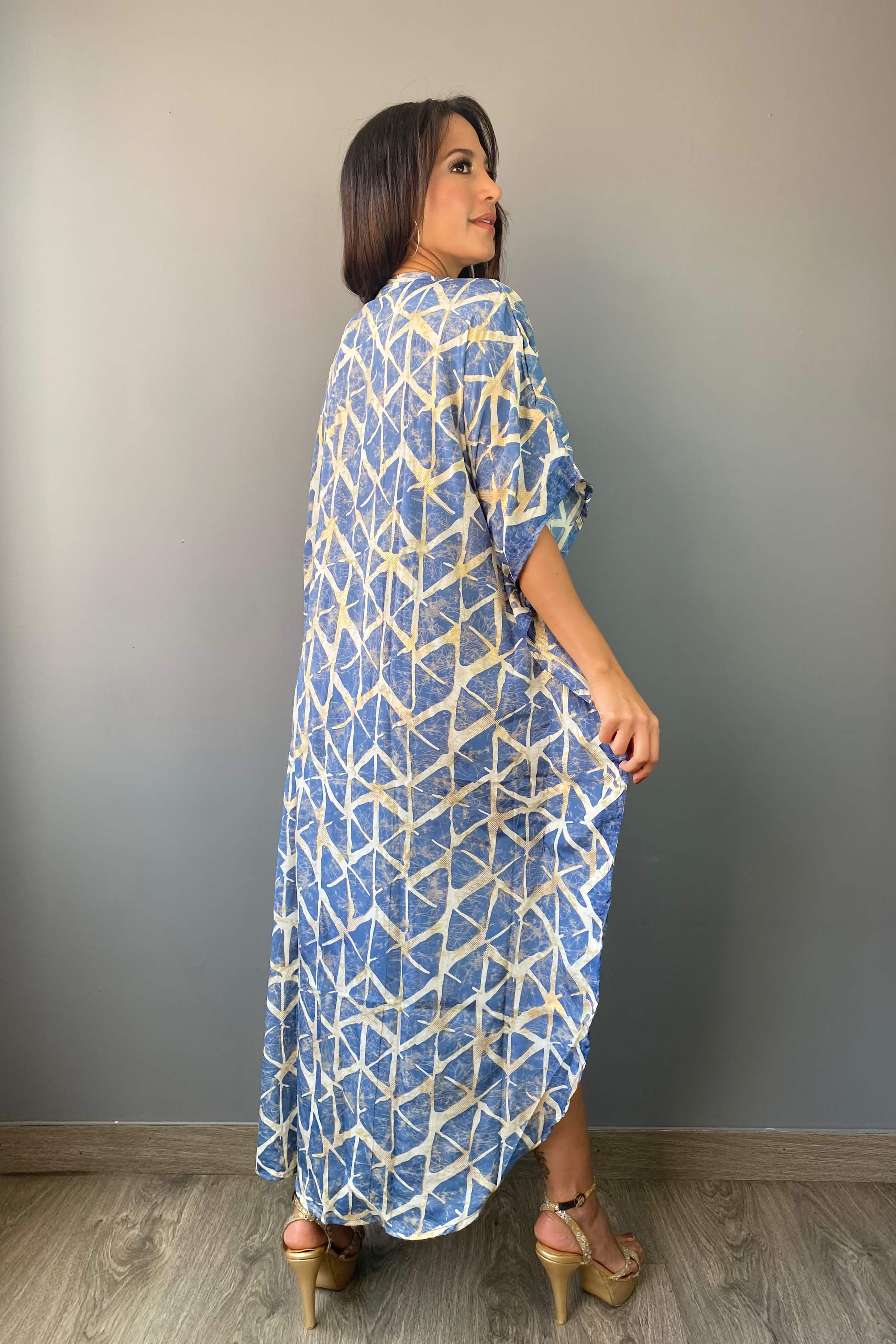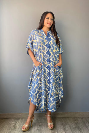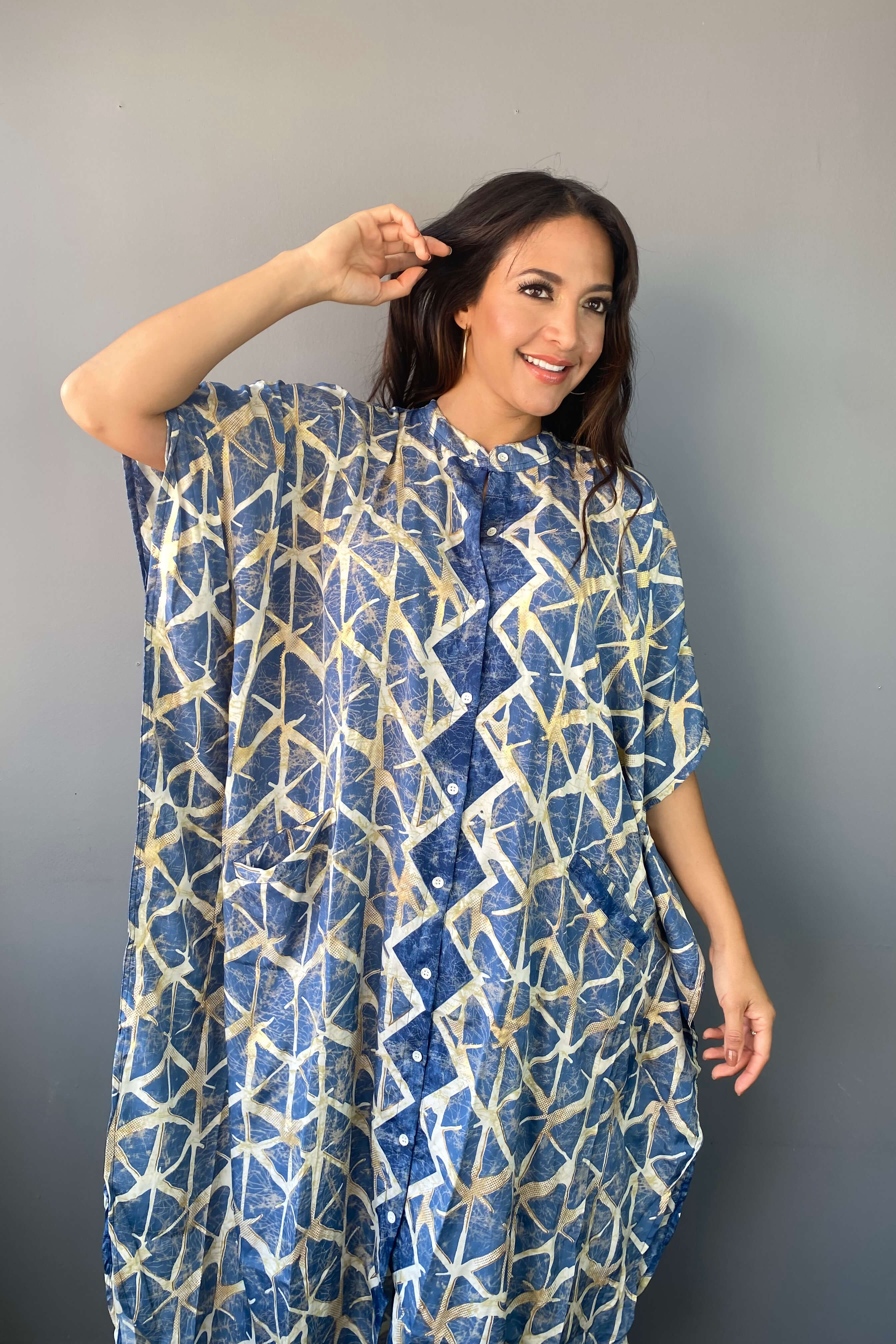 Confeccionado en tela suave y ligera, su diseño oversize con botones delanteros y bolsillos laterales lo convierte en una prenda cómoda y práctica para el día a día. El estampado étnico en tonos azules y dorados le da un aire bohemio y artístico, ideal para destacar sin esfuerzo.