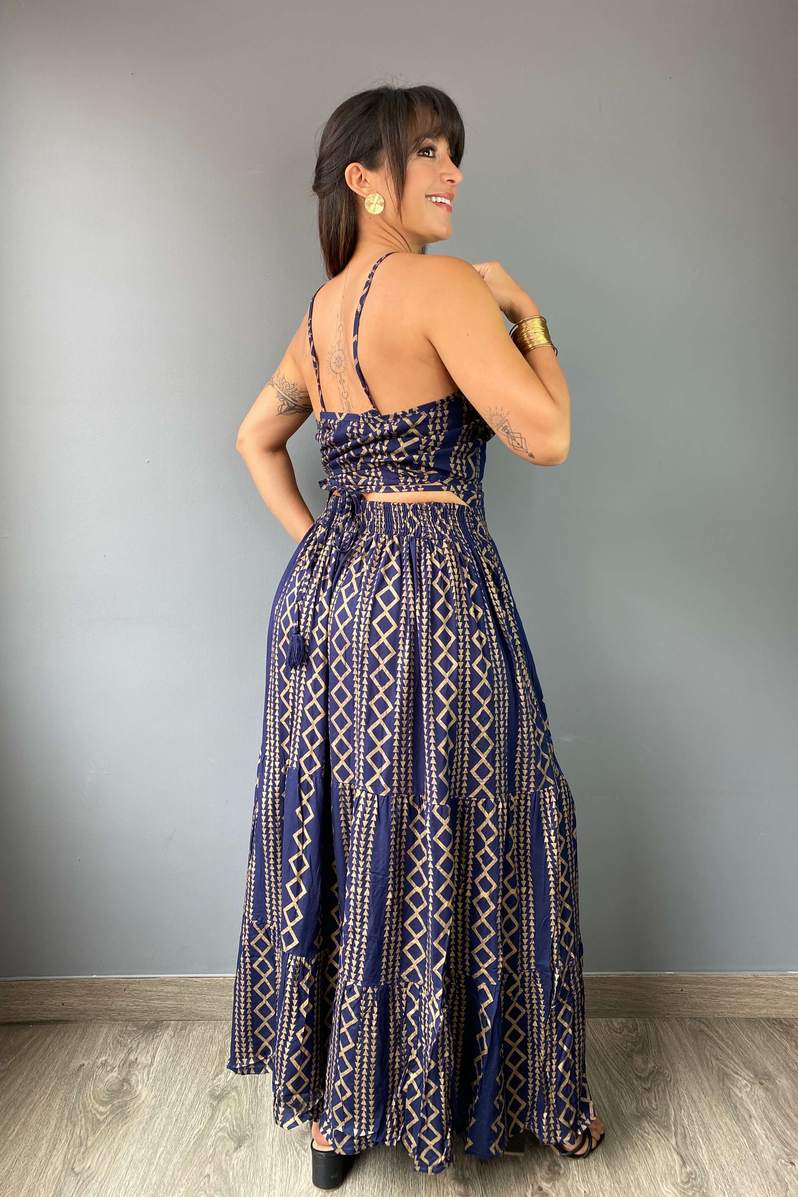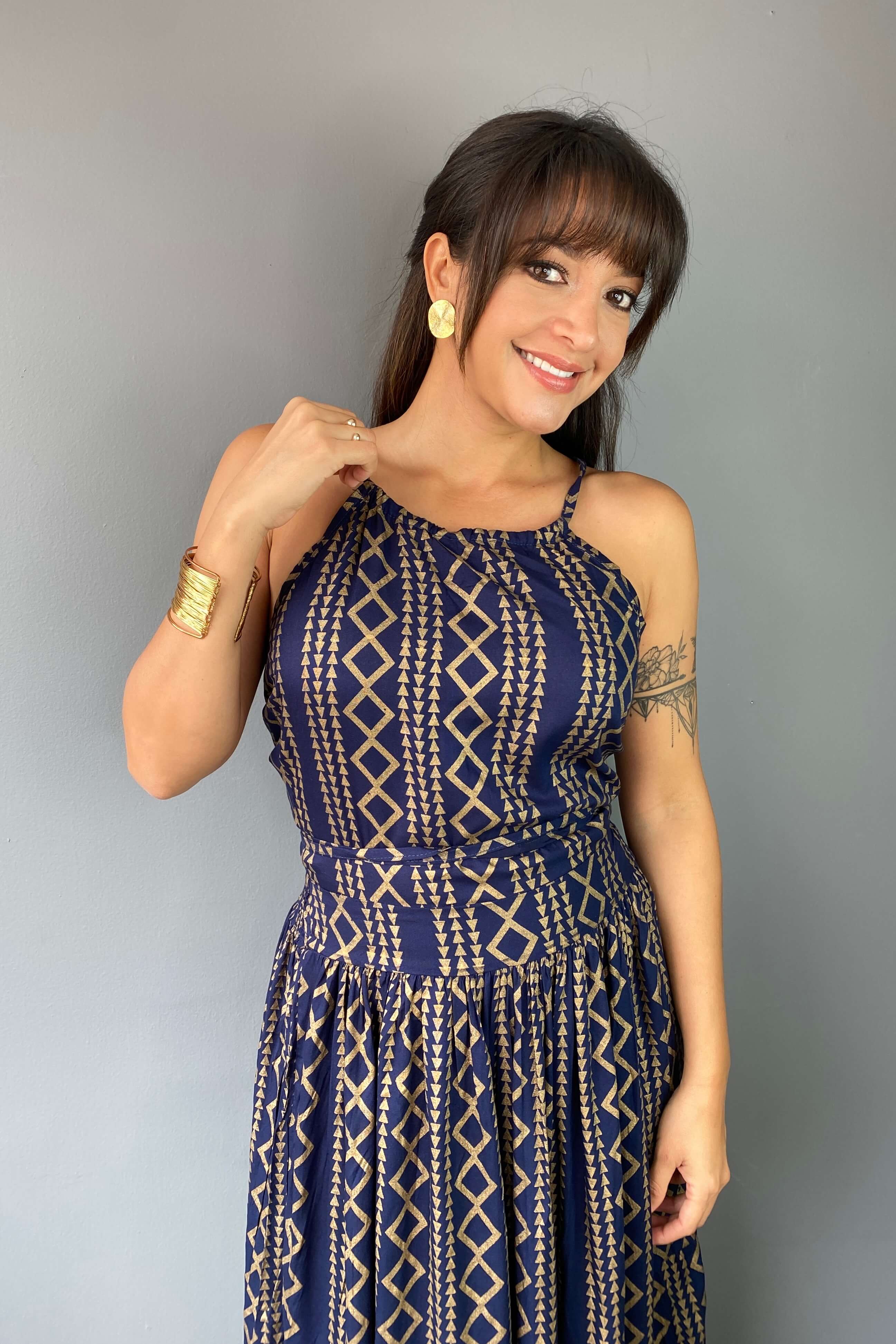 Este vestido largo destaca por su elegante estampado geométrico en azul y dorado. Su diseño con espalda descubierta y tiras ajustables permite adaptarlo perfectamente a tu cuerpo, brindando comodidad y estilo. La falda amplia con caída fluida crea un look bohemio sofisticado ideal para días soleados o noches especiales.