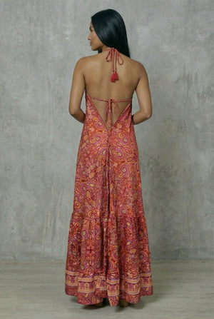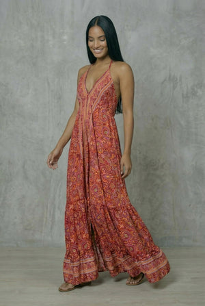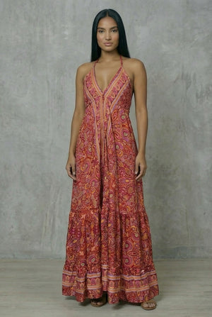 Vestido Boho confeccionado en seda fría hindú, una tela suave, fresca y con excelente caída. Tiene tiras ajustables para adaptarse a tu gusto.
