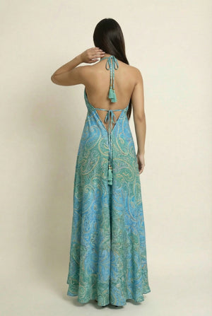 Vestido Boho confeccionado en seda fría hindú, una tela suave, fresca y con excelente caída. Tiene tiras ajustables para adaptarse a tu gusto.