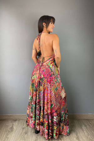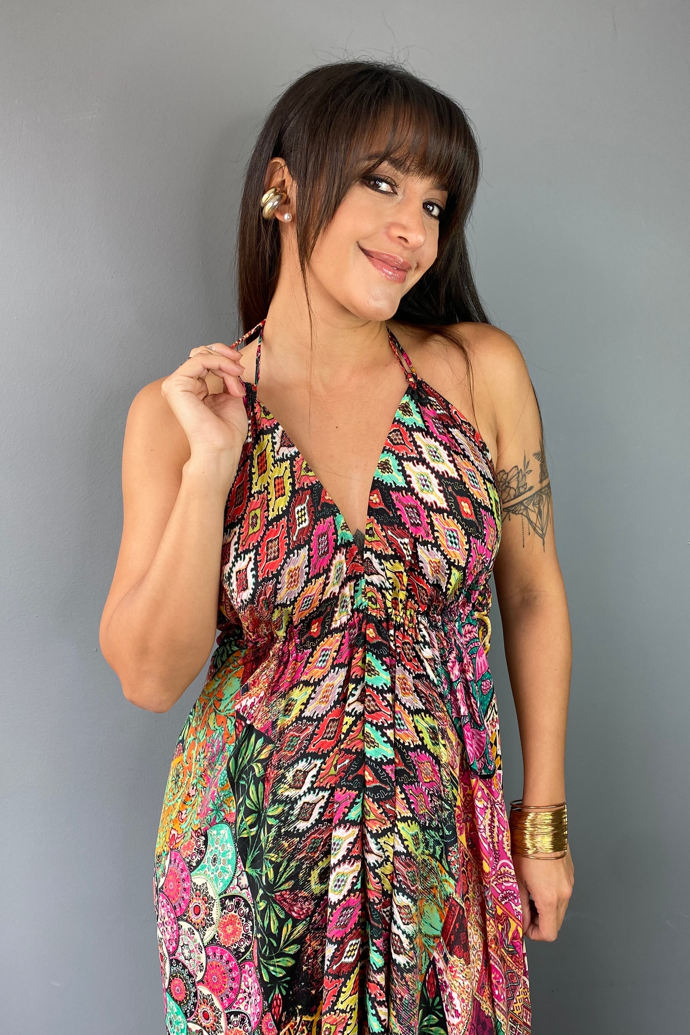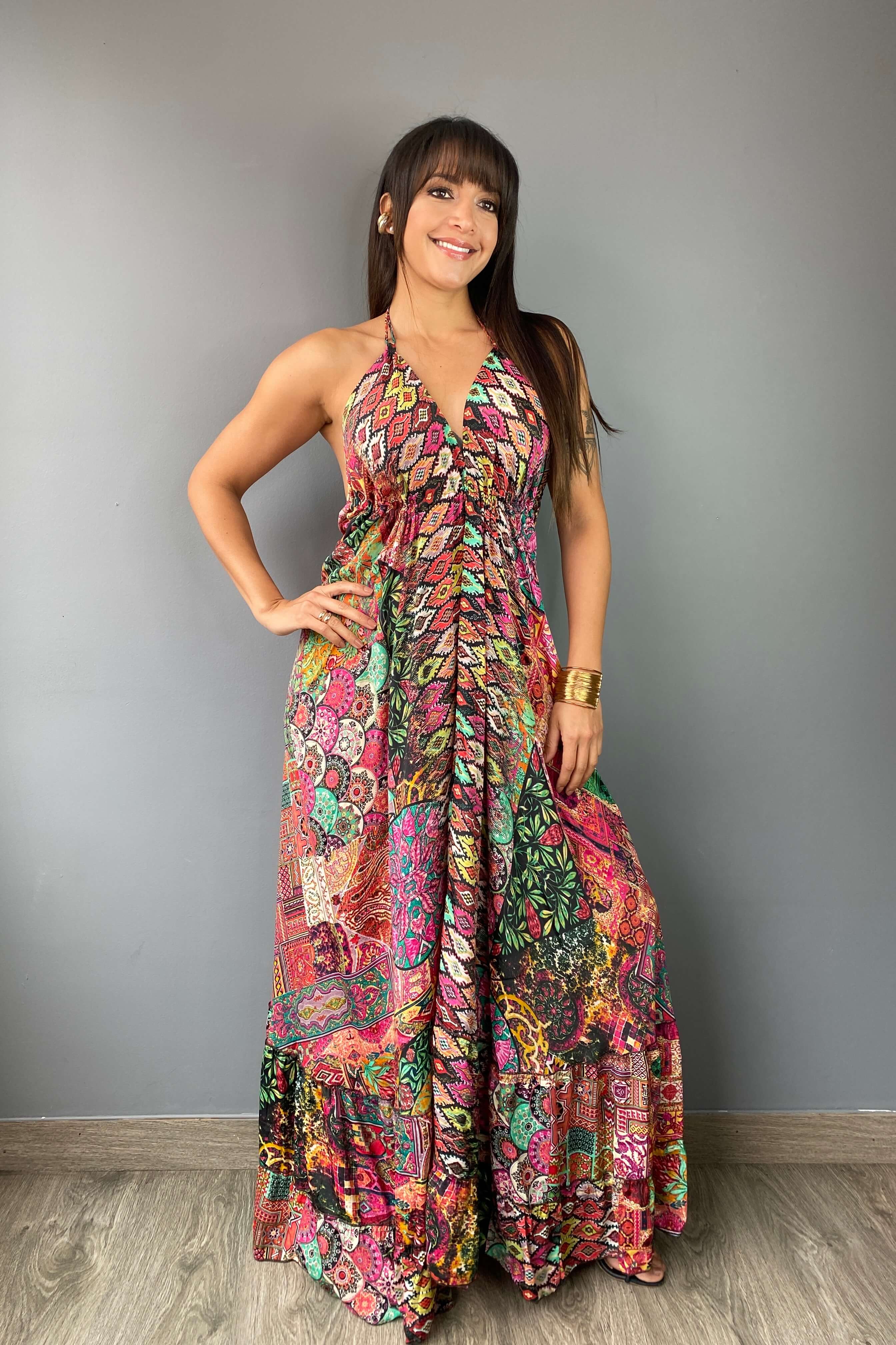 Este vestido largo destaca por su diseño ajustable en busto y alto, que se adapta perfectamente a diferentes tipos de cuerpo. Su estampado colorido y vibrante, refleja toda la esencia libre y auténtica del estilo bohemio. La caída amplia de la falda le da un movimiento encantador y elegante, ideal para días soleados, vacaciones o salidas especiales.