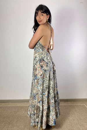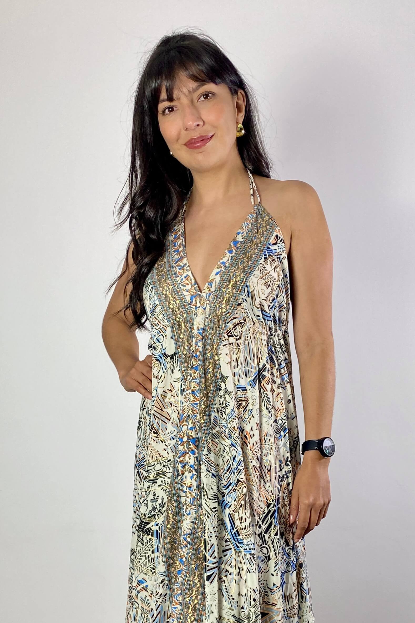 Vestido Boho confeccionado en seda fría hindú, una tela suave, fresca y con excelente caída. Tiene tiras ajustables para adaptarse a tu gusto.