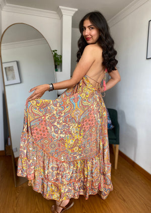 Vestido Boho confeccionado en seda fría hindú, una tela suave, fresca y con excelente caída. Tiene tiras ajustables para adaptarse a tu gusto.