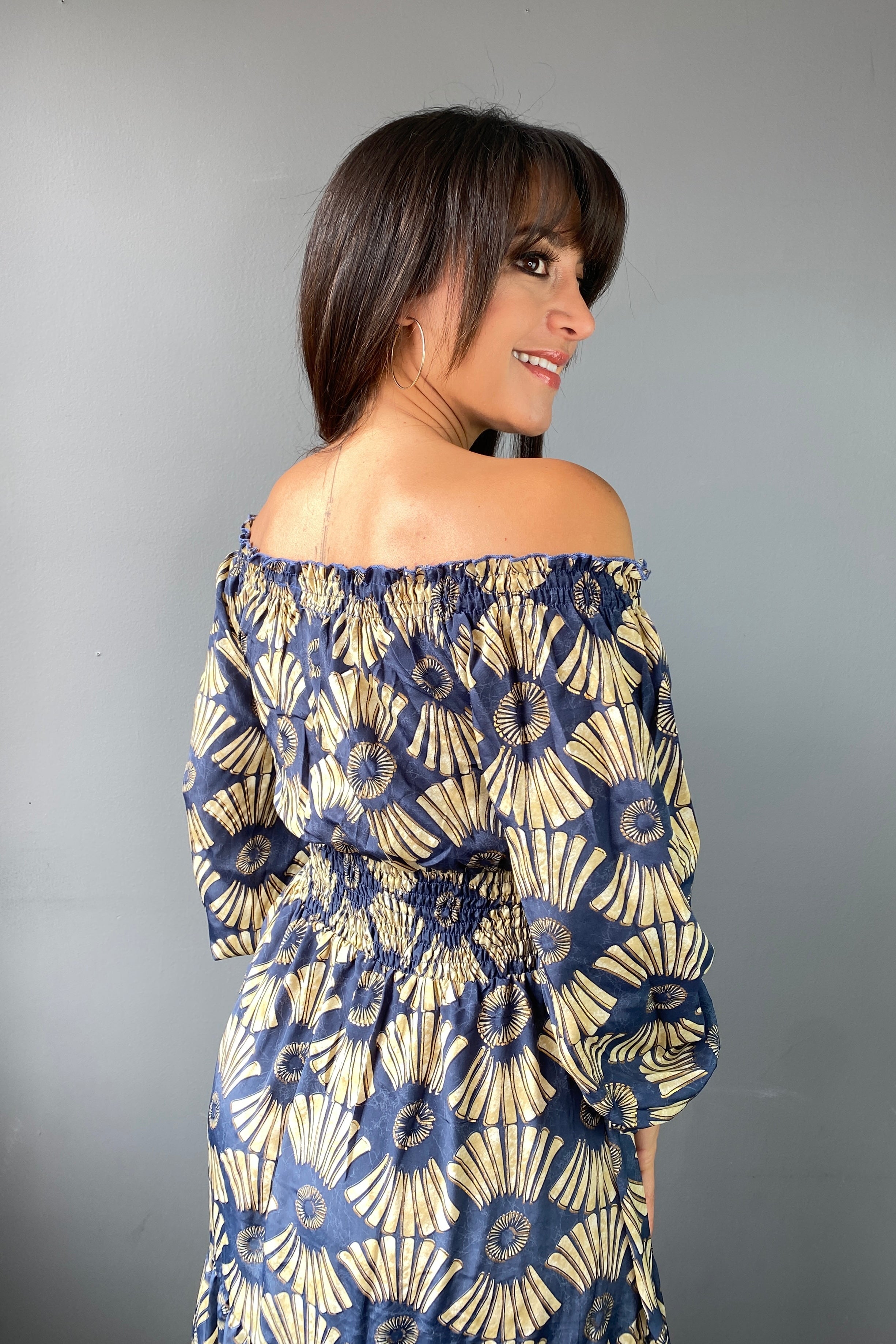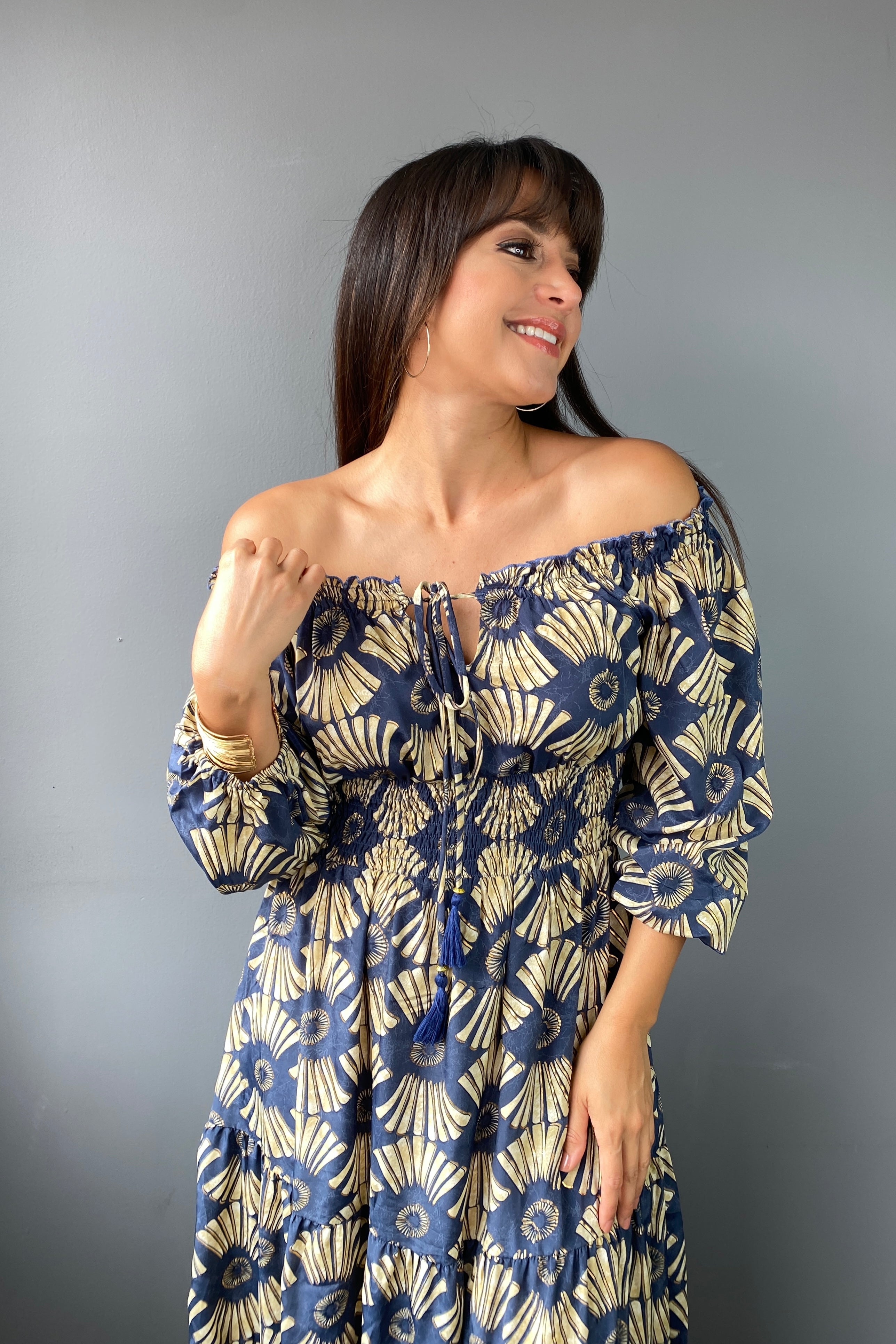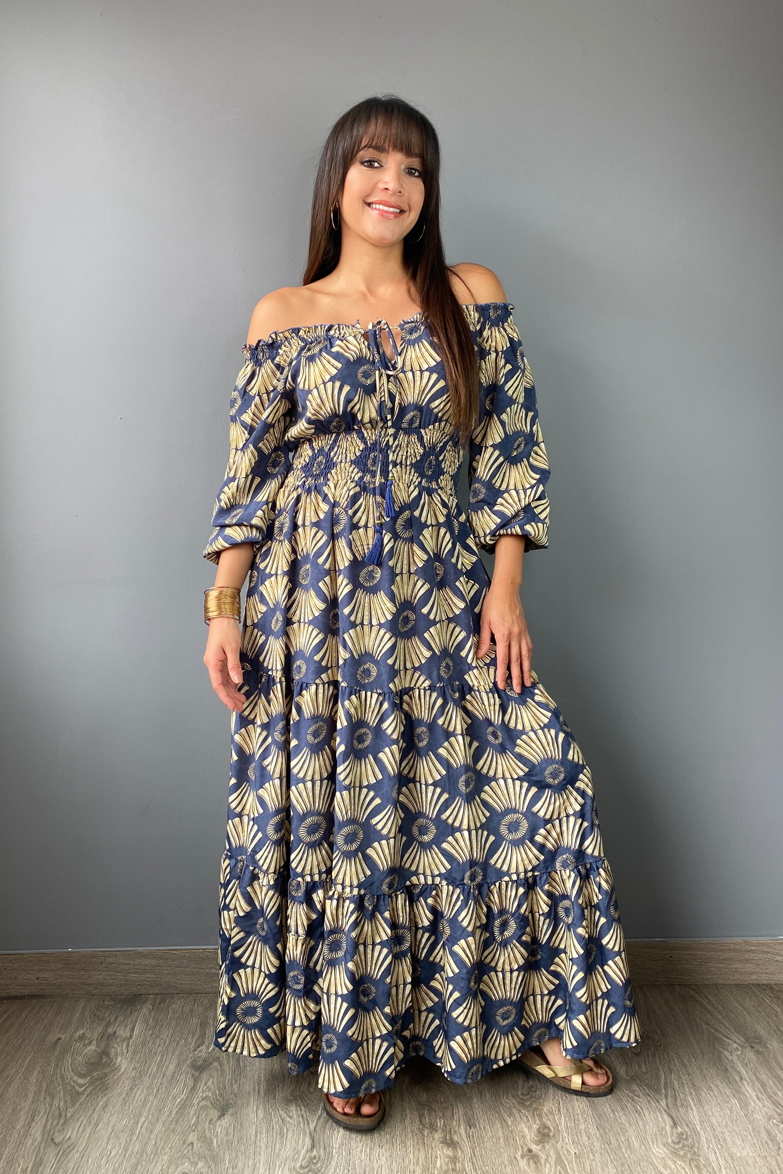 Este vestido largo con estampado floral bohemio combina elegancia y frescura. Su diseño con hombros descubiertos y mangas largas aporta un toque romántico y versátil, ideal para usar en climas templados o frescos. La parte superior elástica y la cintura elastica se adaptan perfectamente a tu figura, brindando comodidad y estilo en cada movimiento.
