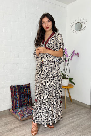 Vestido Kaftan una prenda versátil y elegante que transformará tu estilo. Hecho en  seda hindú, ofrece suavidad y una sofisticación incomparable. Perfecto para cualquier ocasión, desde salidas casuales hasta eventos especiales.