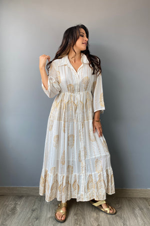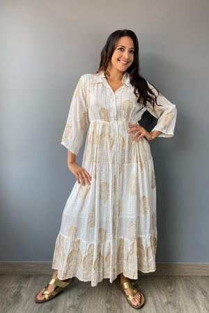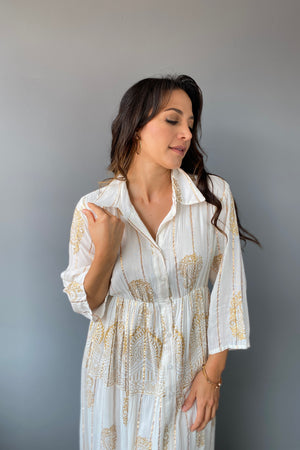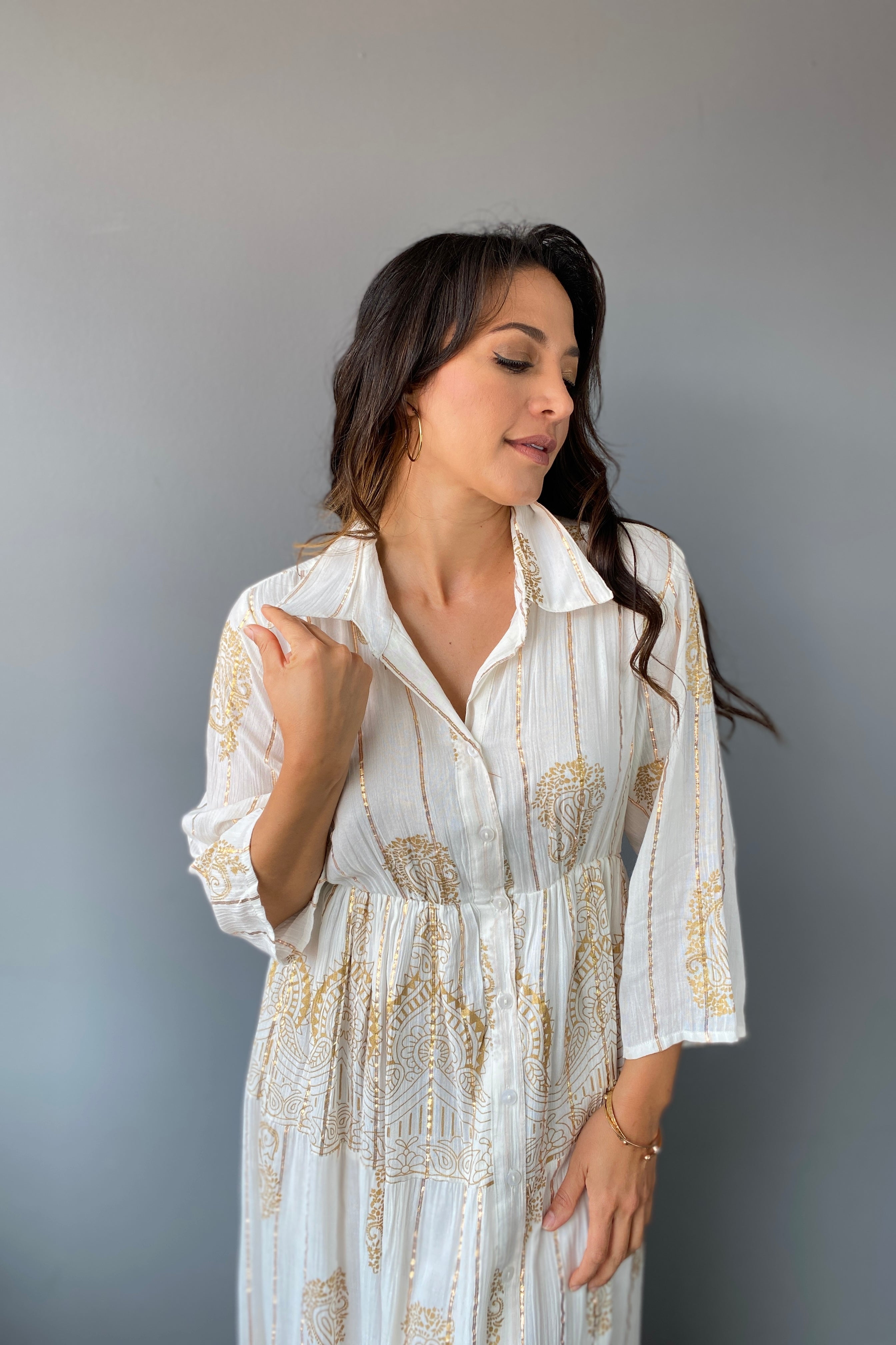 Este vestido blanco con delicados apliques dorados y mangas amplias es una joya bohemia para ocasiones especiales.