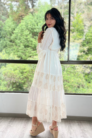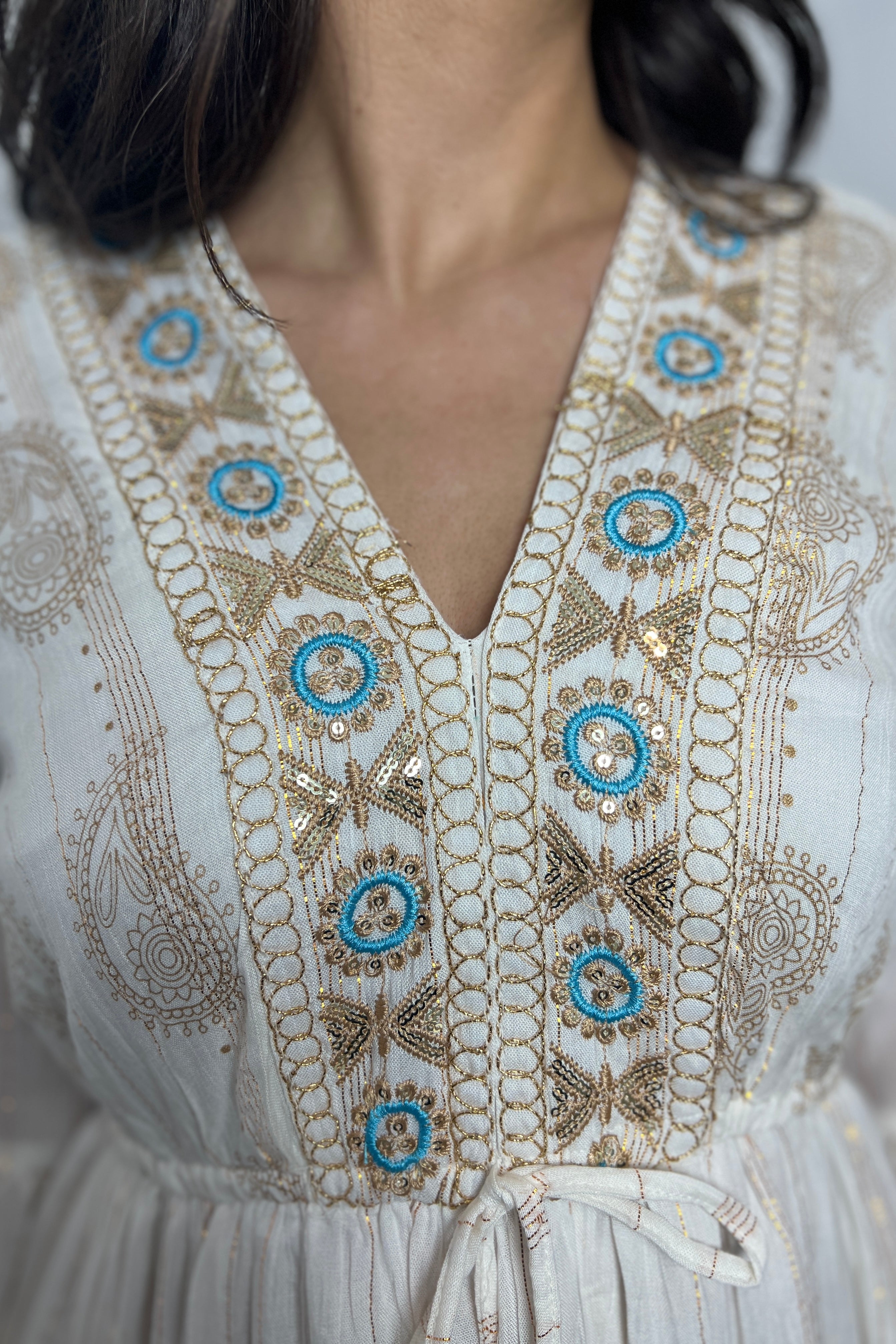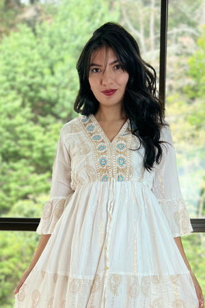 Este vestido blanco con delicados apliques dorados y mangas amplias es una joya bohemia para ocasiones especiales.
