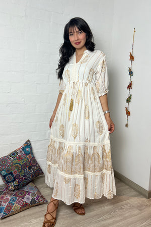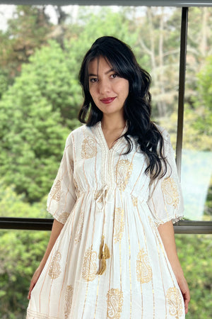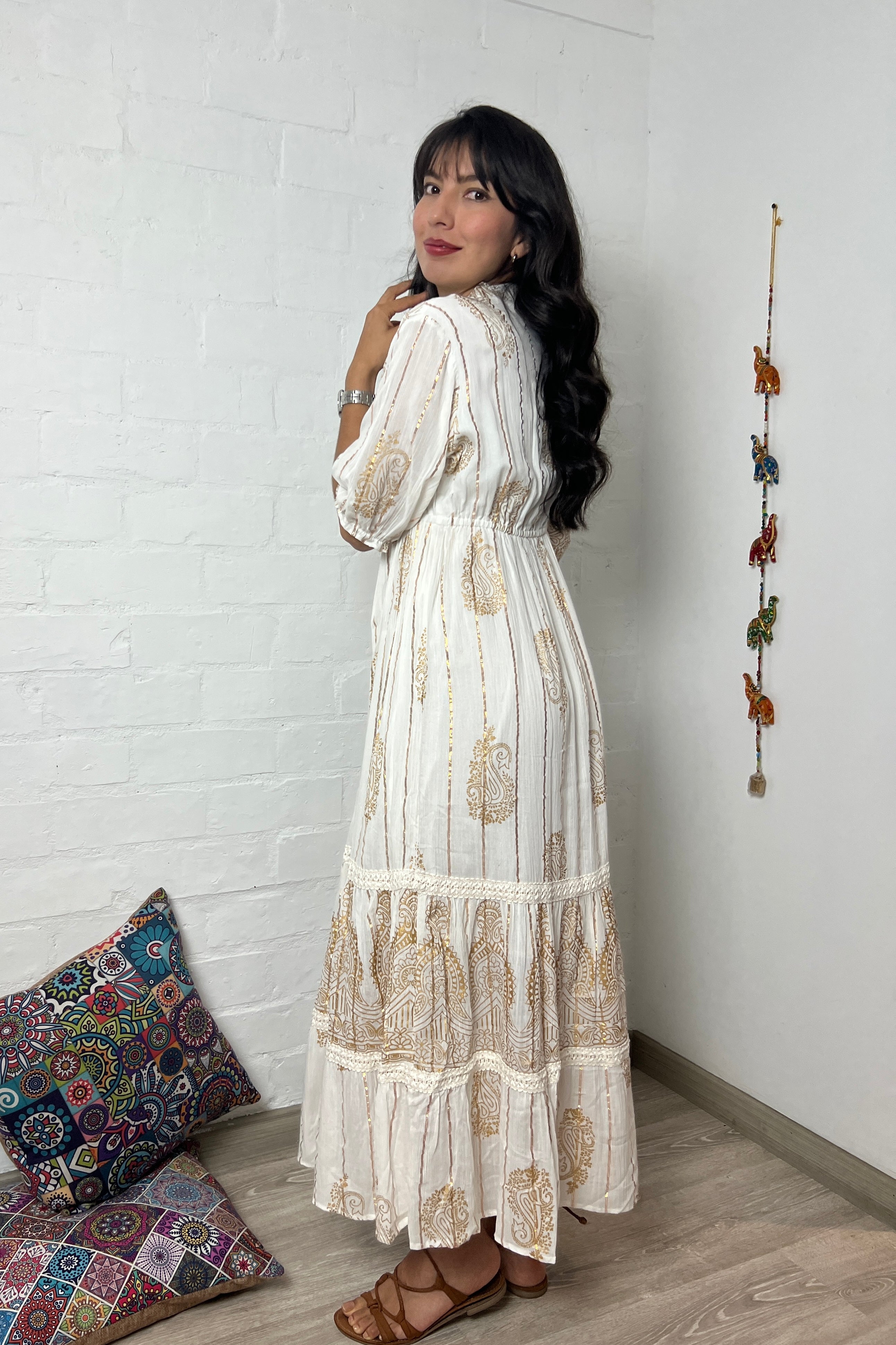 Este vestido blanco con delicados apliques dorados y mangas amplias es una joya bohemia para ocasiones especiales.