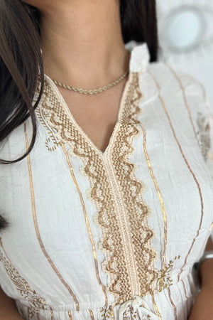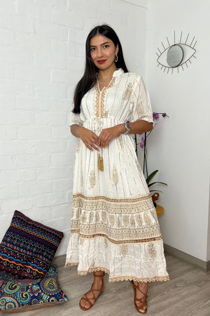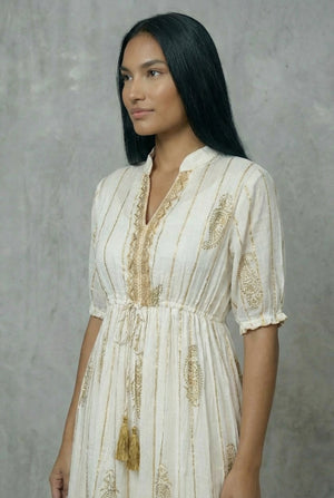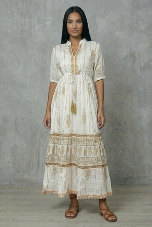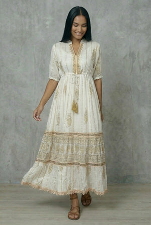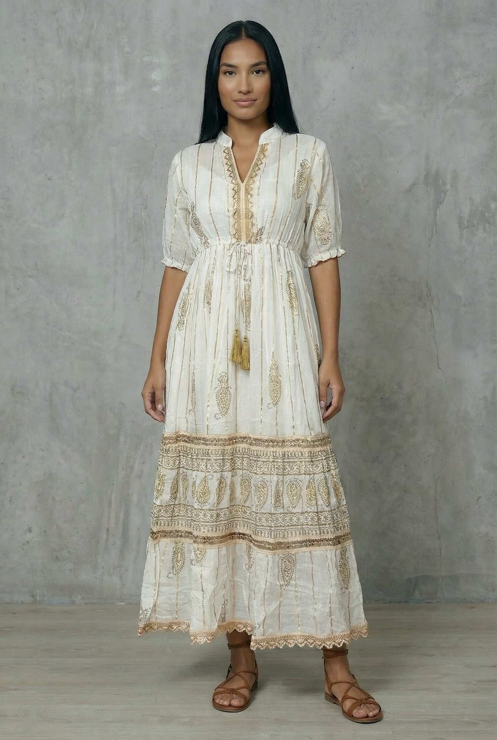 Vestido largo con apliques dorados, una prenda versátil y elegante que transformará tu estilo. Ofrece suavidad y una sofisticación incomparable. Perfecto para cualquier ocasión, desde salidas casuales hasta eventos especiales.