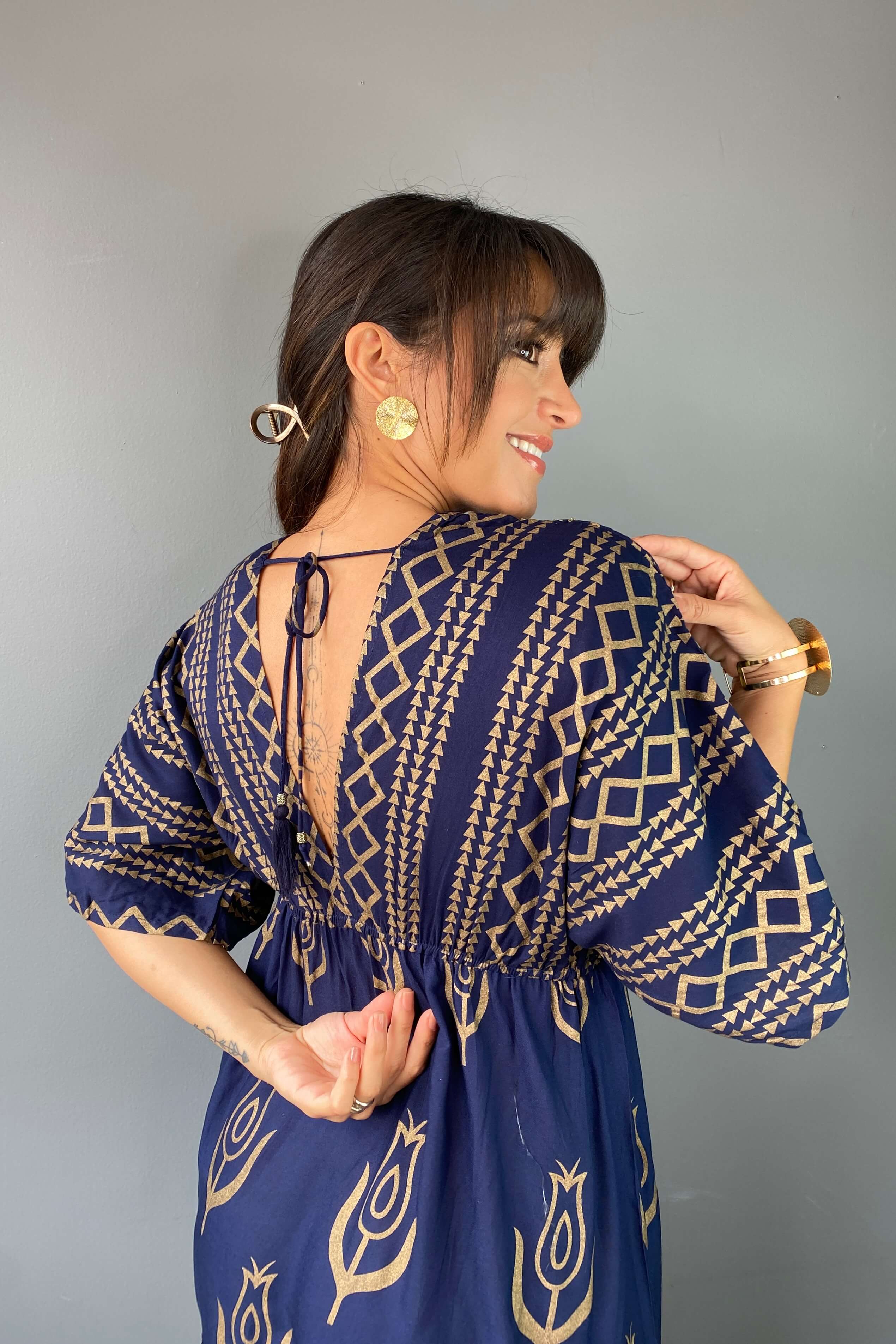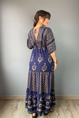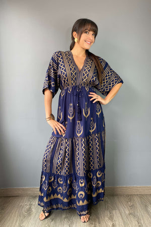 Este vestido largo es pura elegancia bohemia. Su diseño fluido con mangas amplias, escote en V y estampado dorado sobre fondo azul lo hacen ideal para lucir cómoda y sofisticada en cualquier ocasión. Tiene amarre en la espalda para un ajuste perfecto y detalles únicos que destacan tu estilo.