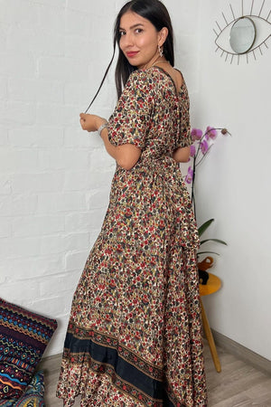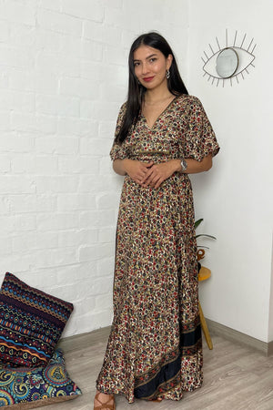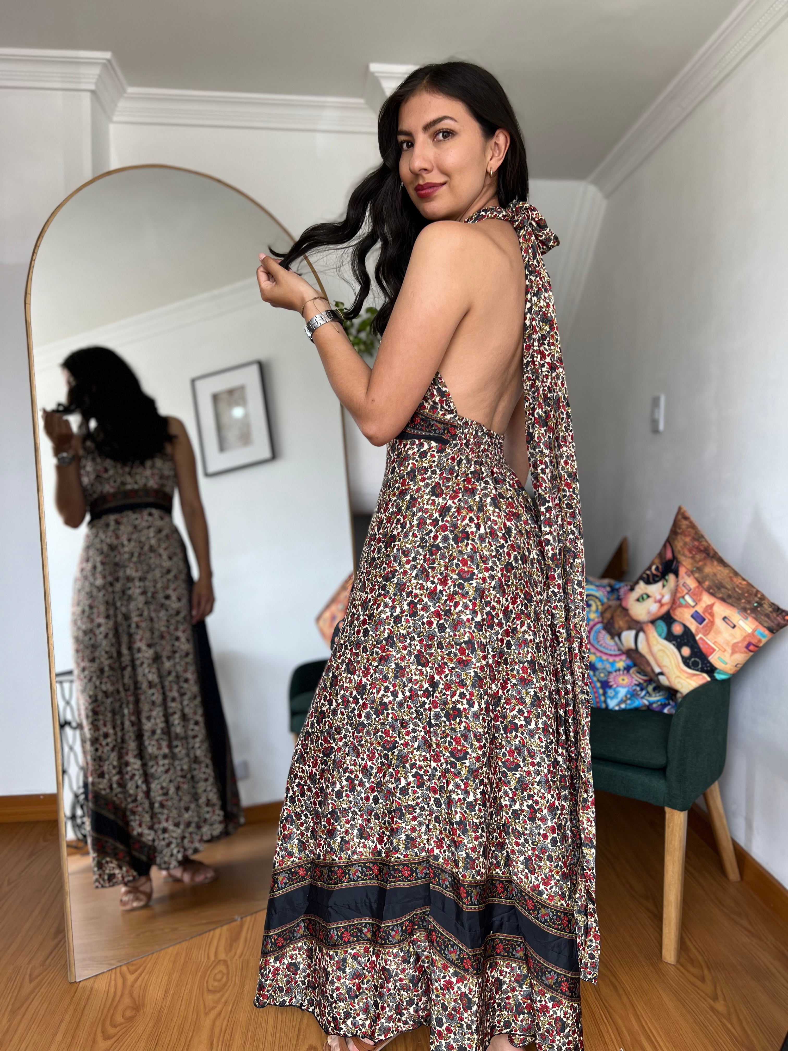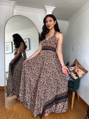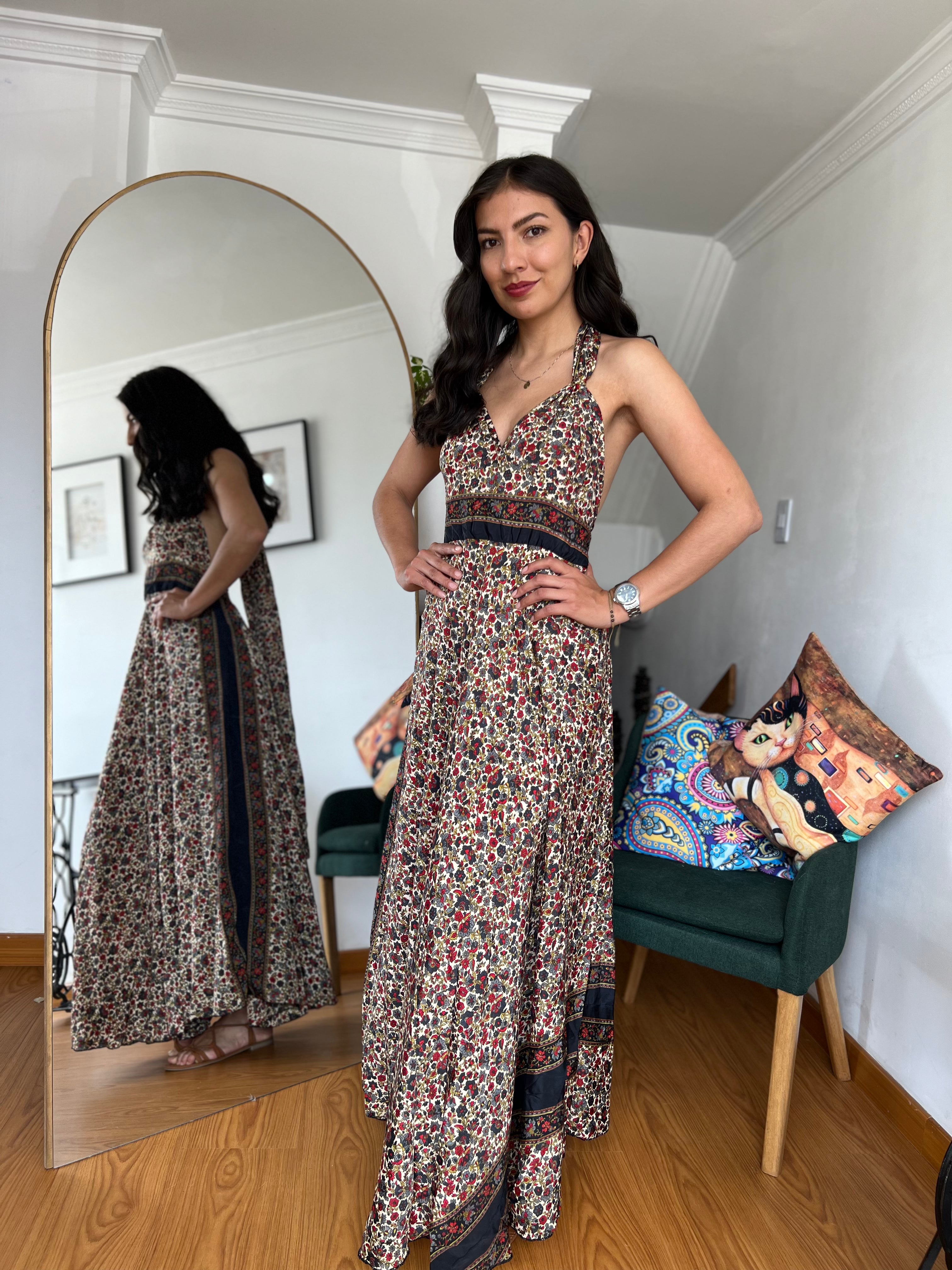 Vestido Sarih de seda fría hindú con estampado, una tela suave, fresca y de excelente caída. Este vestido es versátil y se puede usar de muchas formas diferentes, ¡deja volar tu imaginación!