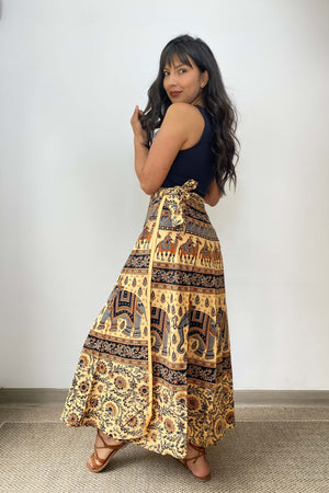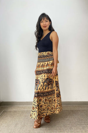 Falda larga envolvente confeccionada en algodón hindú. La tela está impresa con técnicas artesanales, importada de la India.