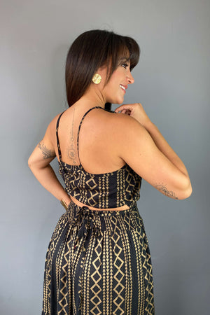 Este vestido largo destaca por su elegante estampado geométrico en negro y dorado. Su diseño con espalda descubierta y tiras ajustables permite adaptarlo perfectamente a tu cuerpo, brindando comodidad y estilo. La falda amplia con caída fluida crea un look bohemio sofisticado ideal para días soleados o noches especiales.