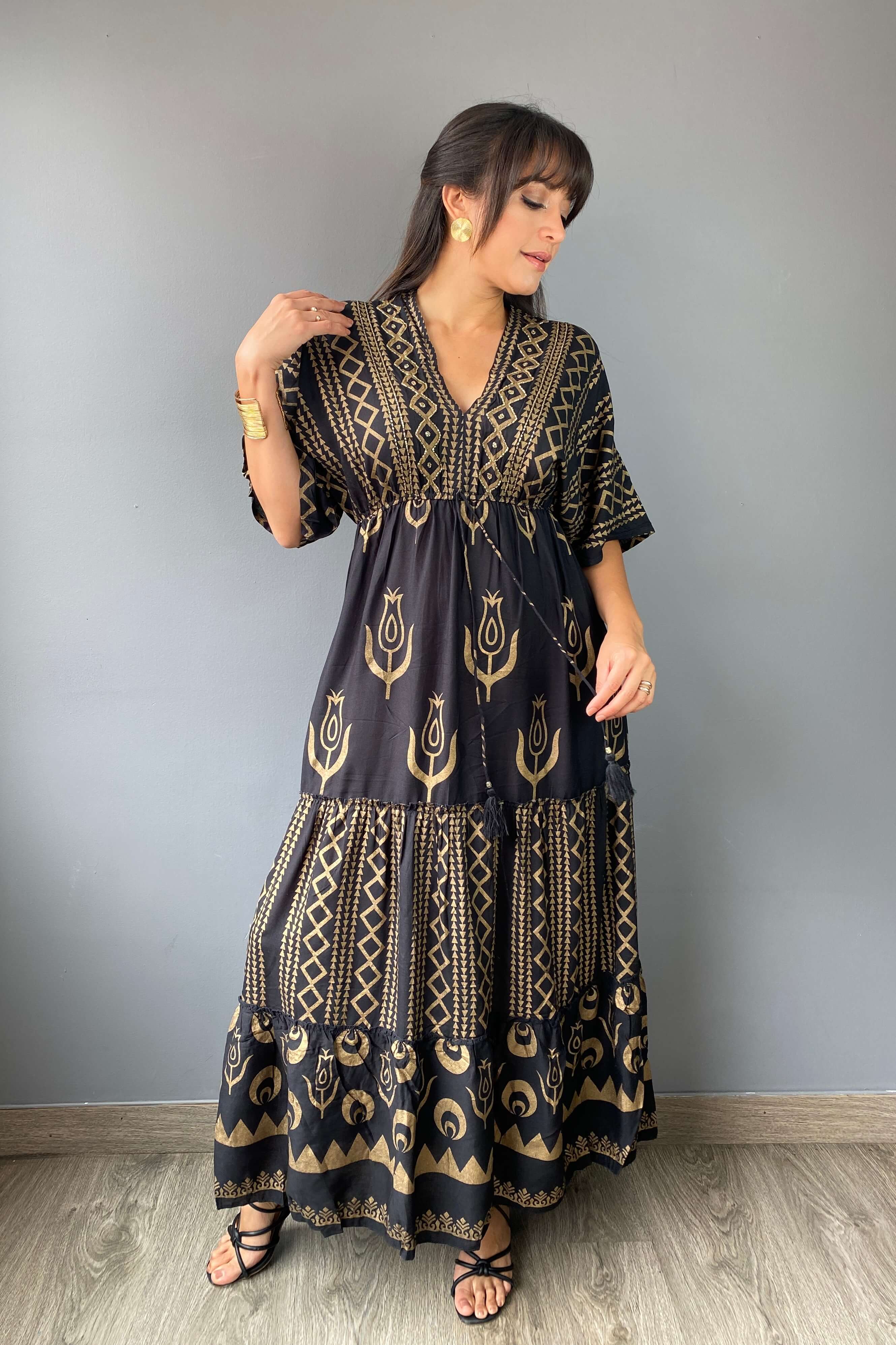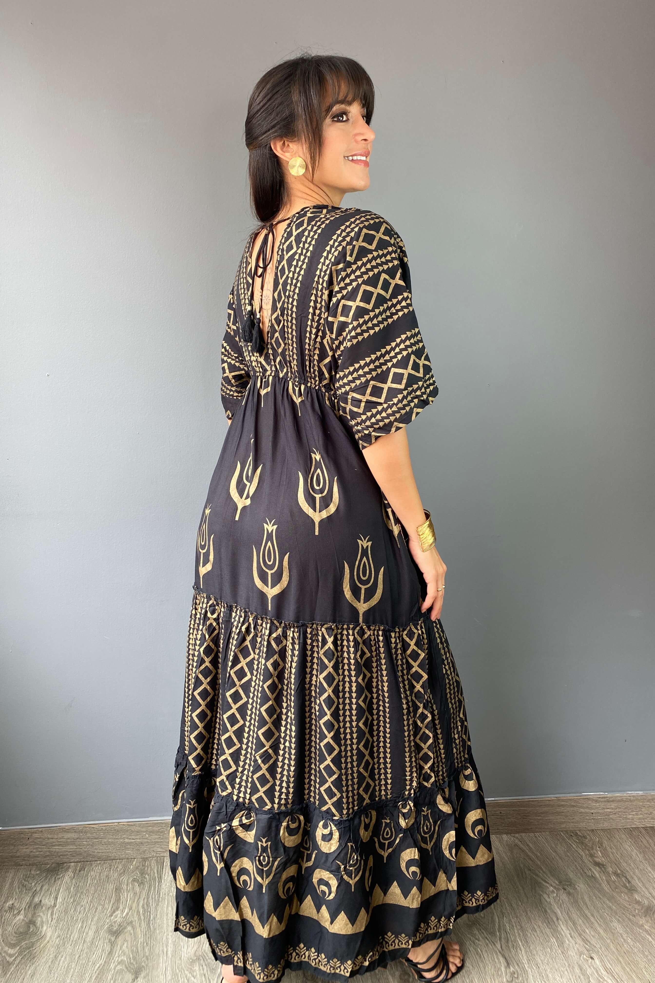 Este vestido largo es pura elegancia bohemia. Su diseño fluido con mangas amplias, escote en V y estampado dorado sobre fondo negro lo hacen ideal para lucir cómoda y sofisticada en cualquier ocasión. Tiene amarre en la espalda para un ajuste perfecto y detalles únicos que destacan tu estilo.